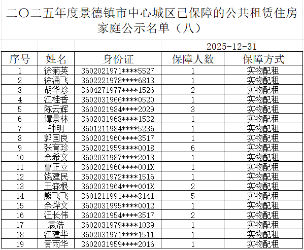 二〇二五年度景德镇市中心城区已保障的公共租赁住房家庭公示名单(八)