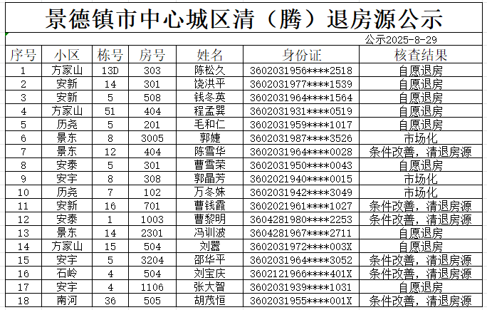 通过年审,经审核 ,安新,石岭,安泰,安宇,方家山,景东安厦,南河,历尧共有18户住房保障对象,因条件改善等原因自愿退出。依据《公共租赁住房管理办法》(住建部第11号令)、《关于加快发展公共租赁住房的指导意见》(建保【2010】87号)、《公共租赁住房管理办法》景府办发〔2023〕7 号等相关文件对保障房实行动态管理的要求,现对上述住房保障对象作出取消其相应住房保障资格的决定。