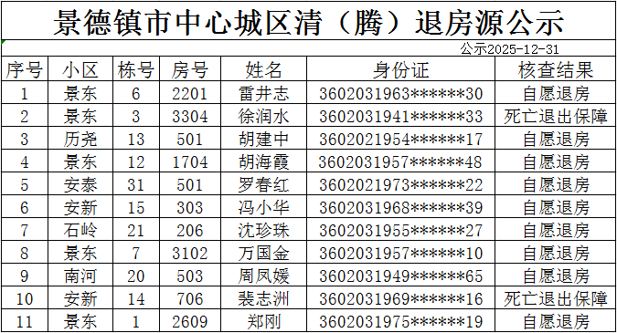 通过年审,经审核 历尧,安泰,安新,景东安厦,南河,石岭共有11户住房保障对象,因条件改善等原因自愿退出。依据《公共租赁住房管理办法》(住建部第11号令)、《关于加快发展公共租赁住房的指导意见》(建保【2010】87号)、《公共租赁住房管理办法》景府办发〔2023〕7 号等相关文件对保障房实行动态管理的要求,现对上述住房保障对象作出取消其相应住房保障资格的决定。