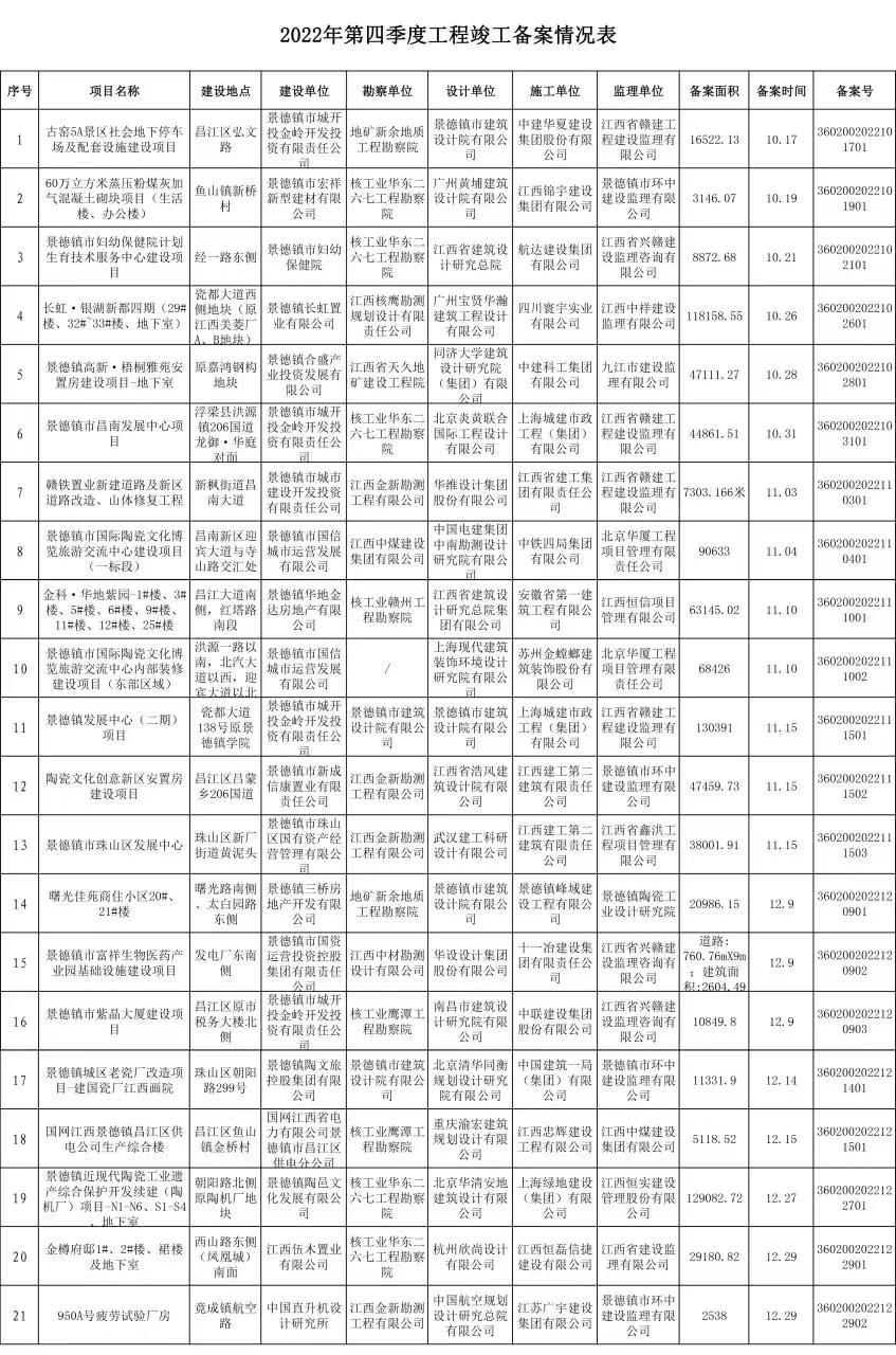 2022年第四季度工程竣工备案情况表