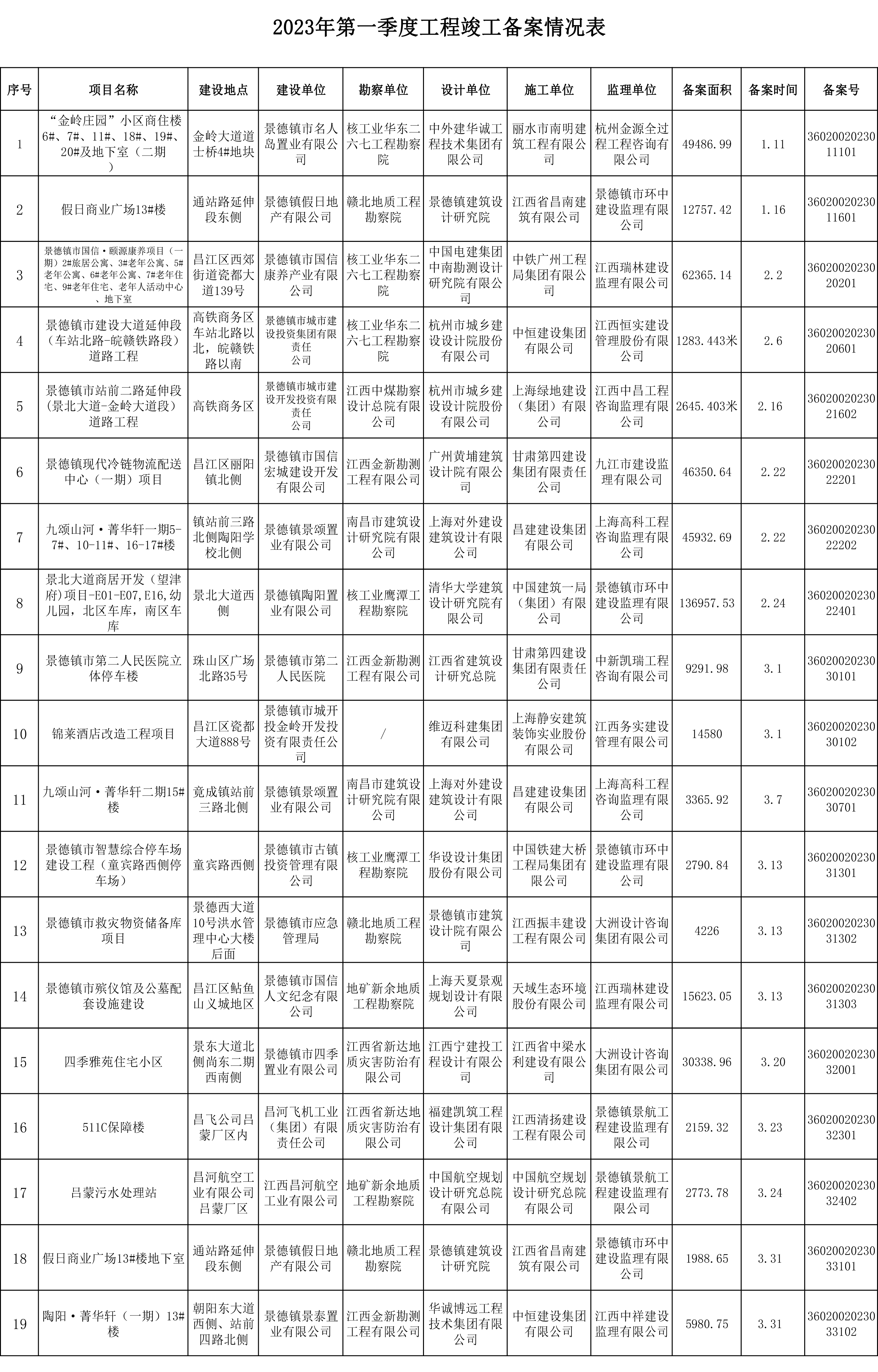 2023年第一季度工程竣工备案情况表