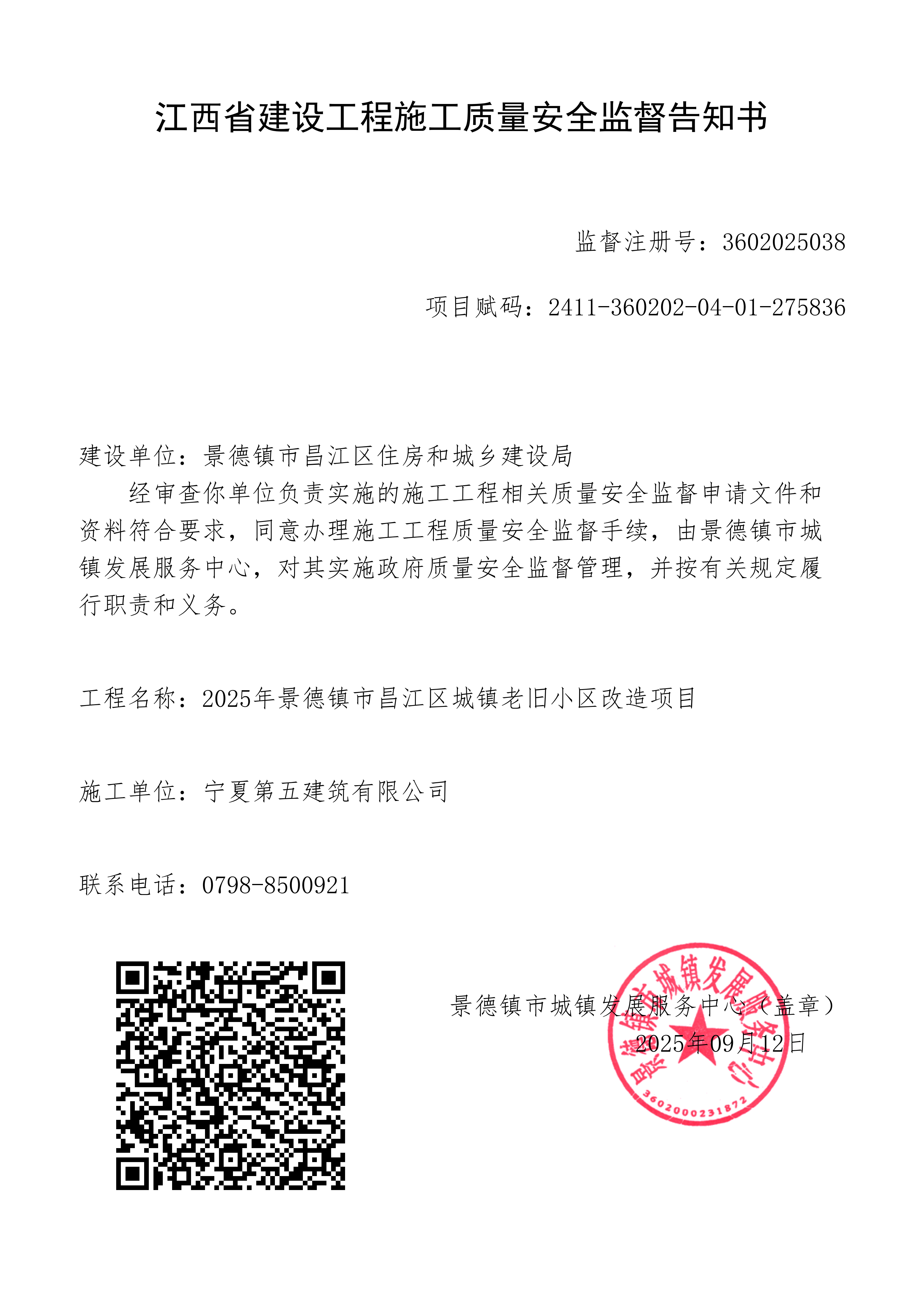 2025年景德镇市昌江区城镇老旧小区改造项目建设工程施工质量安全监督告知书