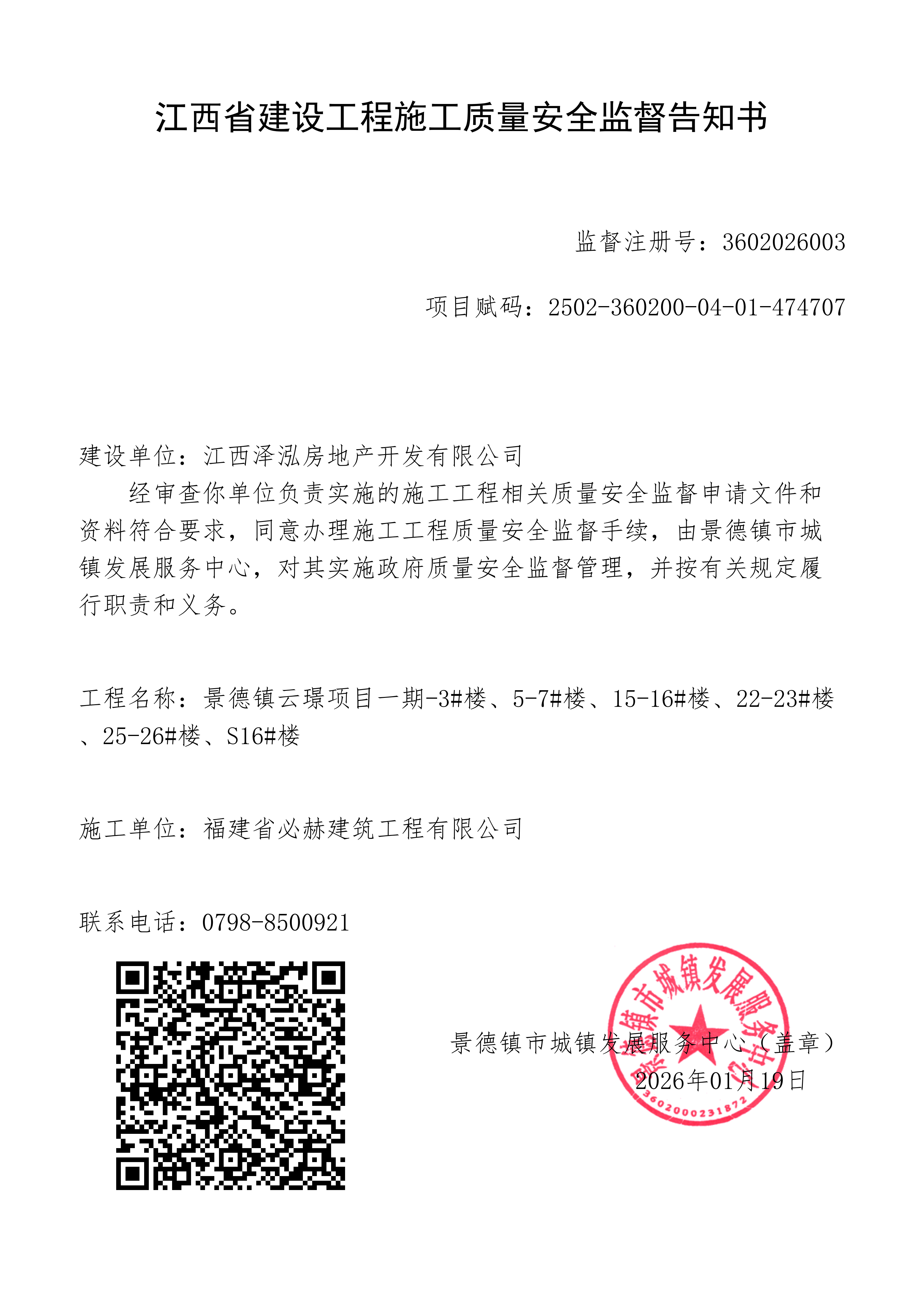 景德镇云璟项目一期-3#楼、5-7#楼、15-16#楼、22-23#楼、25-26#楼、S16#楼建设工程施工质量安全监督告知书