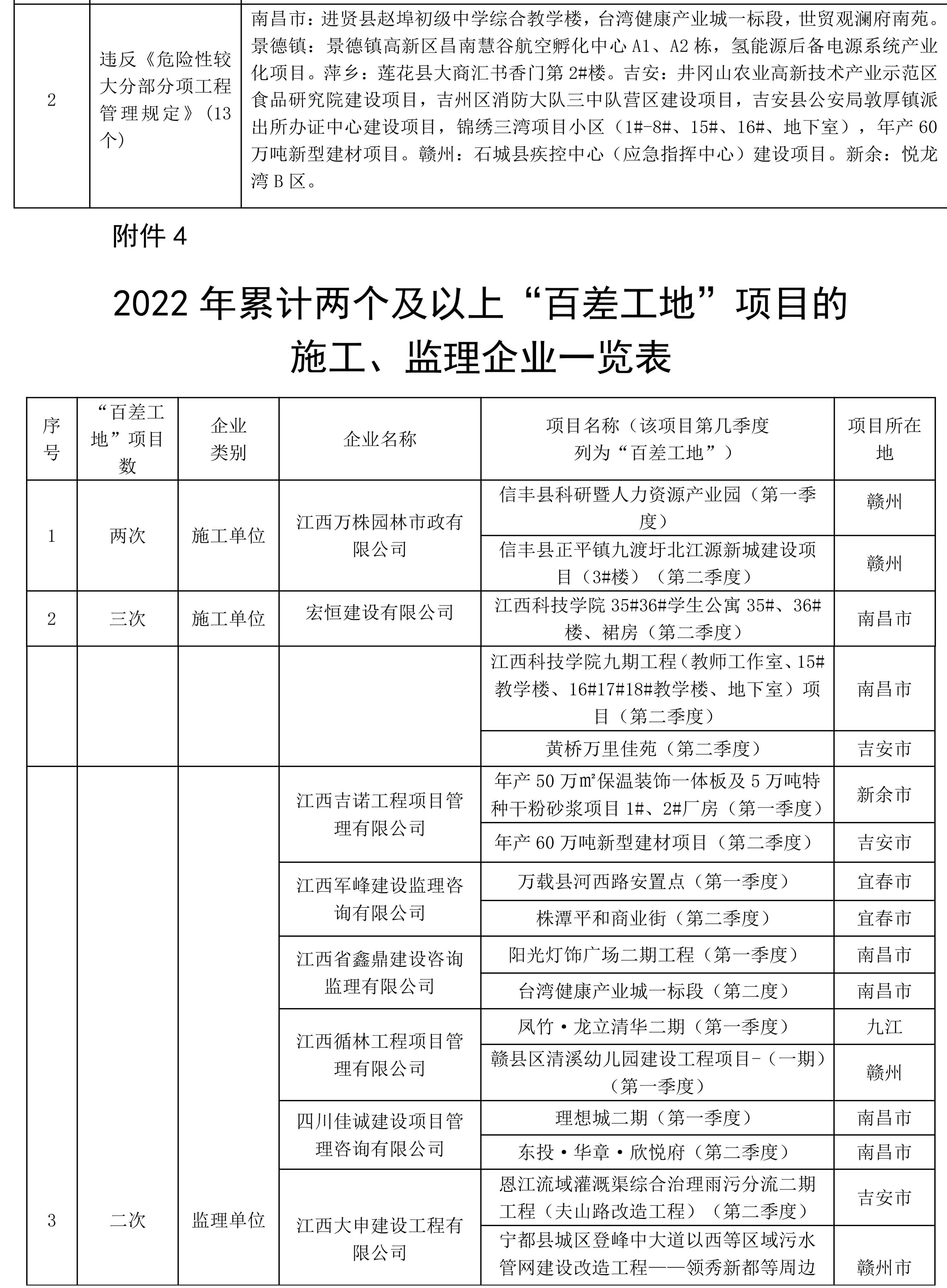 四、对今年以来公布有两个及以上“百差工地”的项目施工、监理企业(详见附件4),请项目所在地住房城乡建设主管部门督促相关企业法人在文件印发之日起15日内,前往省厅安委办接受约谈。